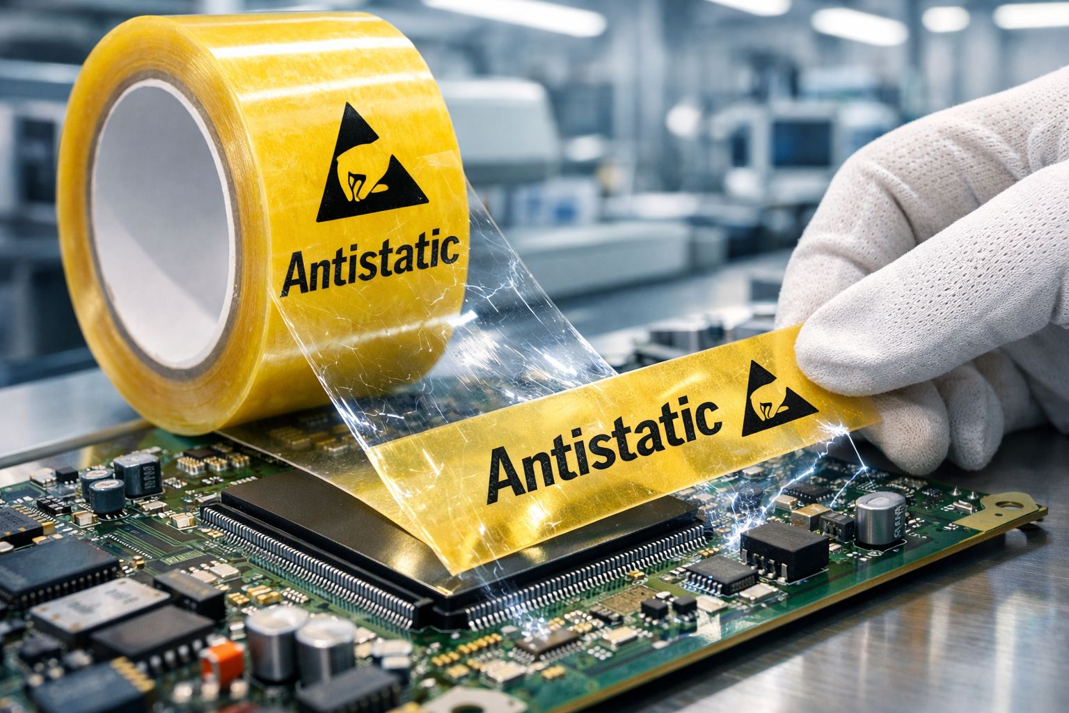 Yapışkan bantlardaki antistatik maddeler, elektronik üretimine doğrudan fayda sağlayan birçok işlevi yerine getirir. Taşıma, montaj ve paketleme süreçleri sırasında statik birikimi azaltırlar. Bu, mikroçiplere, devre kartlarına ve diğer hassas elektronik parçalara zarar verebilecek elektrostatik boşalmayı (ESD) önlemek için çok önemlidir.