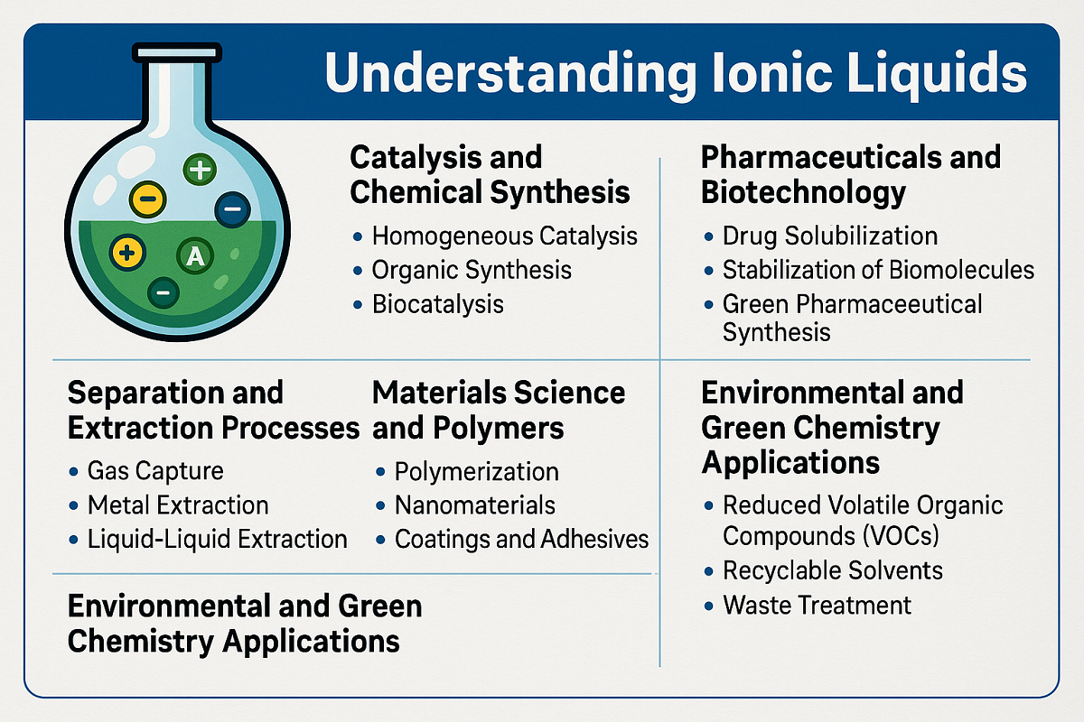 İyonik sıvılar, birçok sektörde endüstriyel süreçleri dönüştüren çok yönlü, ayarlanabilir ve yenilikçi bir kimyasal sınıfını temsil eder. Kataliz ve elektrokimyadan ilaç, malzeme bilimi ve çevre mühendisliğine kadar benzersiz özellikleri, şirketlerin daha güvenli, daha verimli ve sürdürülebilir süreçler tasarlamasına olanak tanır.